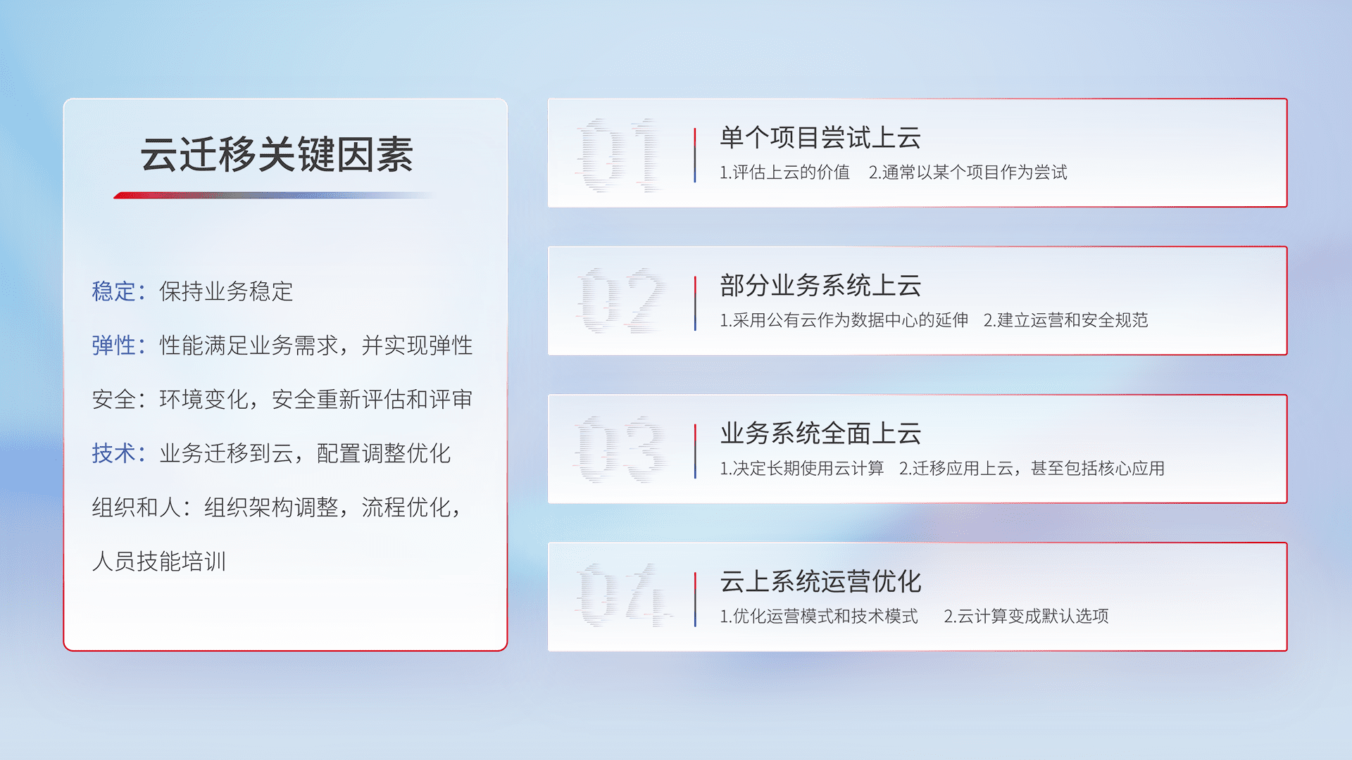 结合实际业务,,,,从规划设计、、、云平台选型、、、、云原生改造、、、数据迁移、、、、集成交付,,,,迁移全过程为客户识别最佳上云路径,,,做好风险识别管理,,,,设计网络架构、、身份权限、、、安全审计合规、、、、操作审计、、日志审计、、监控告警策略、、、多站点容灾设计等,,,对云上基础设施进行整体规划,,,,提升IT治理水平,,,以满足弹性、、、、高可用、、、高性能的需求。。