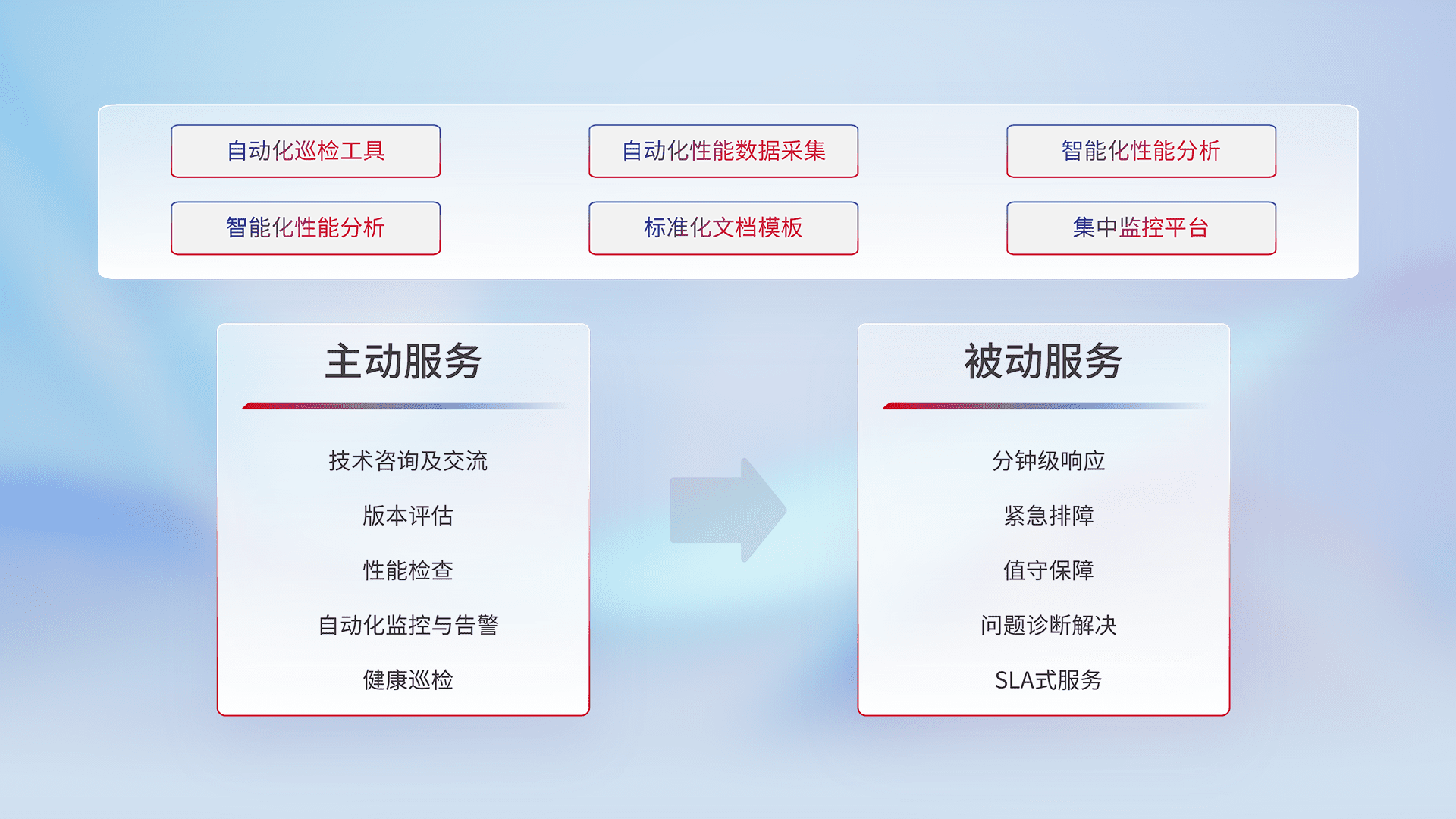 智能化工具和标准化文档,,,保障服务质量,,,,提供主动服务(包含技术咨询、、、、版本评估、、、、性能检查、、、、自动化监控与告警、、、、健康巡检)和被动服务包含(分钟级响应、、紧急排障、、、、值守保障、、问题诊断解决、、SLA服务)。。。